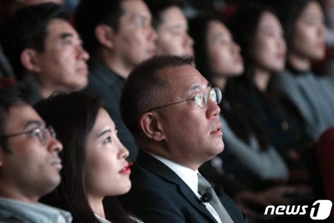 특히 정 회장은 직접 폐 페트병으로 제작한 티셔츠를 입고 나와 눈길을 끌었다. 현대자동차그룹 총수(동일인)가 21년 만에 정의선 회장으로 바뀐다. 대한양궁협회장인 정의선 부회장이 부인 정지선(오른쪽 두번째)씨와 함께 지난해 9월 인천아시안게임에서 활짝 웃고 있다. 정의선은 제9대 대한양궁협회 회장으로 부임하여 한국 양궁 발전에 역력한 노력을 한 인물이라고 할 수 있다. 현재 대한양국협회 회장은 정의선 현대자동차 부회장이다.